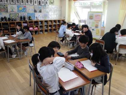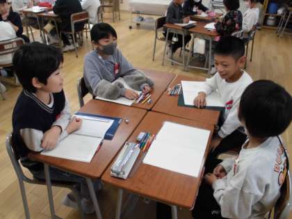4年生国語の様子です。「ごんぎつね」を学習しています。グループになり、自分の考えを伝え合っています。