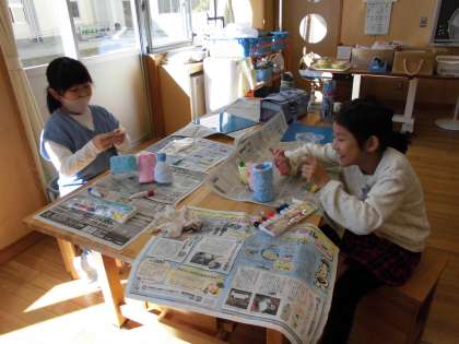 3年生図工の様子です。粘土に着色したり型押しをしたりして、思い思いの作品に仕上げています。