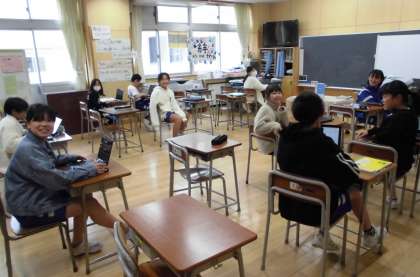 (写真右)5年生、社会で調べたことを、各自でスライドにまとめています。写真を使用するなど、レイアウトも工夫していました。