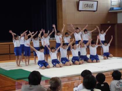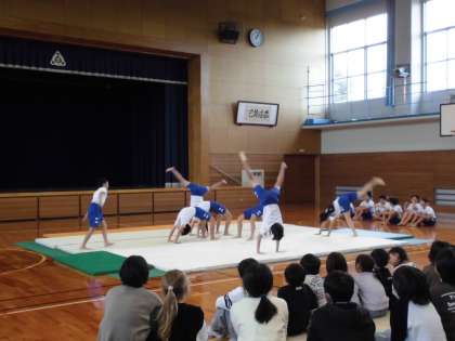 5年生は、学びの発表会で披露する「心と体を一つに チームマット」を全校児童と先生方に見てもらいました。