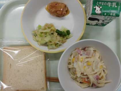 12月15日(金)今日の給食 公開日 2023/12/15 更新日 2023/12/15 給食 今日の給食の献立は、 ・食パン ・照り焼きチキン ・切り干し大根のサラダ ・クリームスパゲッティ ・牛乳 です。