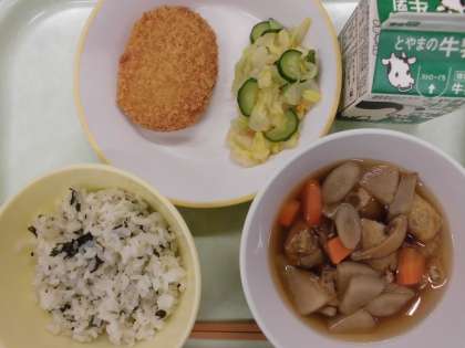 12月18日(月)今日の給食《冬至献立》 公開日 2023/12/18 更新日 2023/12/18 給食 今日の給食の献立は、 ・わかめごはん ・かぼちゃコロッケ ・柚子和え ・冬至の根菜汁 ・牛乳 です。