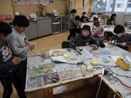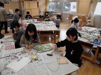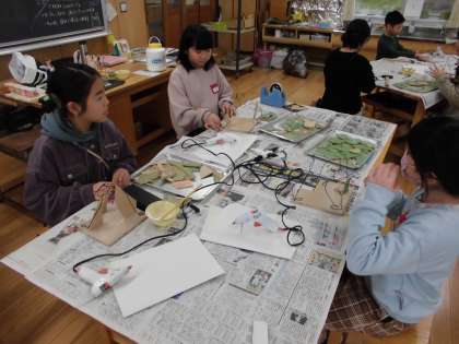 4年生図工の様子です。金槌やグルーガンを使い、作品を仕上げています。