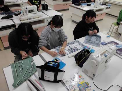 家庭科の様子です。巾着袋を作っています。しつけ糸をしてから、ミシンで縫っていきます。