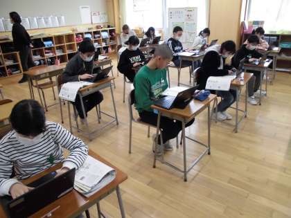 6年生、家庭科の様子です。冬を明るく暖かく生活するための工夫を、クロムブックにまとめていました。