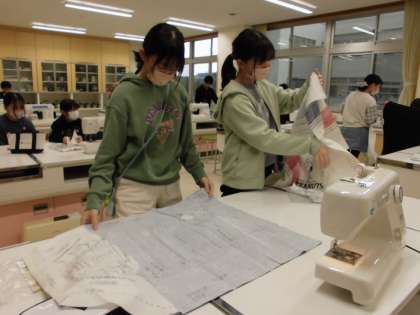 5年生、家庭科の授業の様子です。引き続き、エプロンの製作をしています。