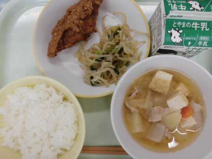 今日の給食の献立は、 ・ごはん ・魚の利休揚げ ・もやしのおひたし ・豚汁 ・牛乳 です。