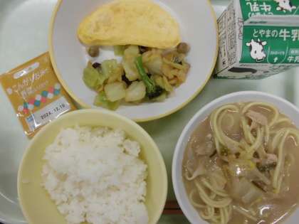 2月14日(水)今日の給食 公開日 2024/02/14 更新日 2024/02/14 給食 今日の給食の献立は、 ・ごはん ・オムレツ ・ビーンズサラダ ・とんこつラーメン ・野菜ふりかけ ・牛乳 です。