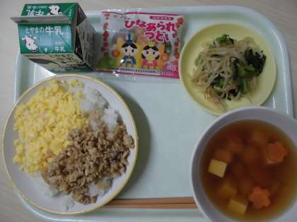 2月26日(月)今日の給食《ひな祭り献立》 公開日 2024/02/26 更新日 2024/02/26 給食 今日の給食の献立は、 ・そぼろどん(ごはん、鶏そぼろ、炒り卵) ・菜花ひたし ・白玉汁 ・雛あられ ・牛乳 です。