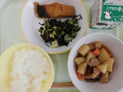 今日の給食の献立は、 ・ごはん ・揚げ魚のレモン味 ・磯和え ・大和煮 ・牛乳 です。