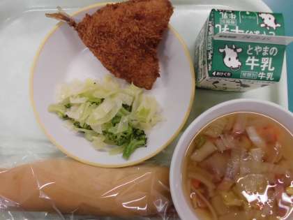今日の給食の献立は、 ・コッペパン ・あじフライ ・ブロッコリーサラダ ・ひよこ豆のスープ ・牛乳 です。