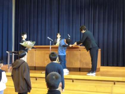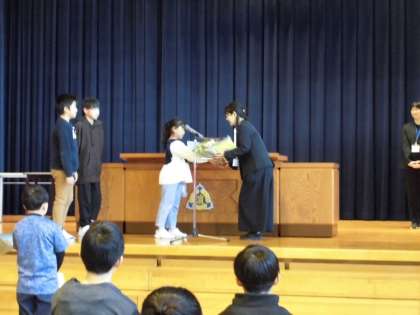 代表の児童が、感謝の言葉と花束を渡しました。「苦手だった授業が楽しくなりました」「器楽の演奏に自信がつきました」等、今までの感謝の気持ちを伝えました。今までありがとうございました。