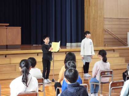 2年生と5年生の代表児童が、1年間を振り返り日々の学習や生活でがんばったことを発表し、みんなで元気よく校歌を歌いました。