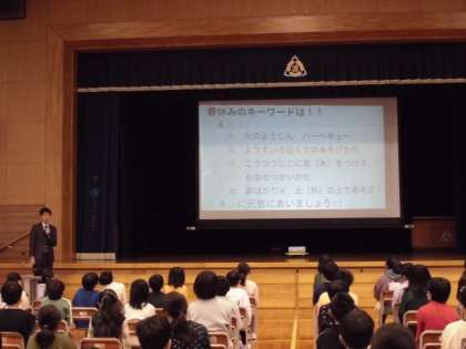 修了式終了後、生徒指導担当の先生から、春休みの過ごし方についての話を聞きました。合い言葉をしっかり覚えて、安全で楽しい春休みを過ごしてほしいと思います。