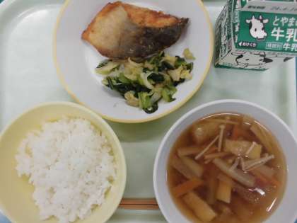 今日の給食の献立は、 ・ごはん ・魚の竜田揚げ ・おひたし ・さわにわん ・牛乳 です。