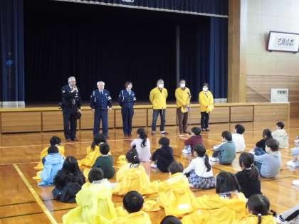 はじめに、全校児童が体育館に集まり、浜黒崎駐在所所長さんから、交通安全についてのお話を聞きました。横断歩道の渡り方など、自分の命を守るために大切なことをたくさん教えていただきました。
