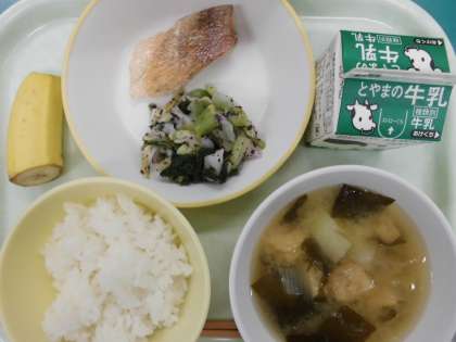 今日の給食の献立は、 ・ごはん ・赤魚の塩焼き ・ゆかり和え ・味噌汁 ・バナナ ・牛乳 です。