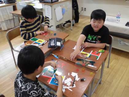 2年生、図工の様子です。セロハンを思いのままに切り貼りしています。光を通すと、どのように見えるのでしょうか。