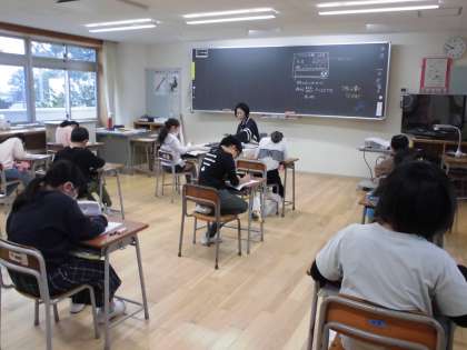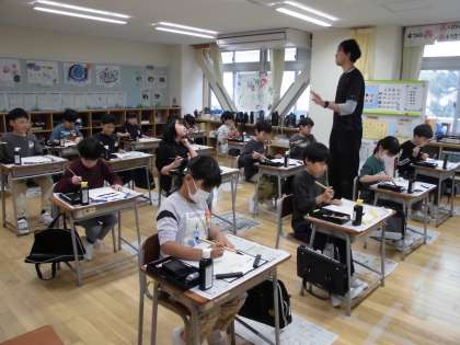 3年生、書写の様子です。穂先の角度など筆づかいに気をつけて、横線を書いています。
