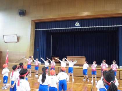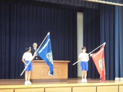 運動会は、赤青の2つの団に分かれて競います。今日は、結団式を行いました。校長先生から2人の団長に団旗が手渡されました。