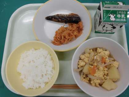 今日の給食の献立は、 ・ごはん ・鰯の生姜味 ・切り干し大根のケチャップ炒め ・卵とじ ・牛乳 です。