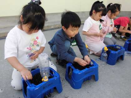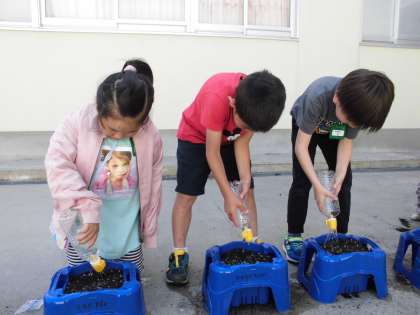 1年生は、あさがおの種を植えました。一つ一つ丁寧に種を植え、水やりをしました。子供たちは、あさがおの成長を楽しみにしている様子でした。