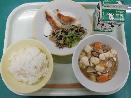 5月14日(火)今日の給食 公開日 2024/05/14 更新日 2024/05/14 給食 今日の給食の献立は、 ・ごはん ・焼きぎょうざ ・小松菜とひじきのナムル ・えびと豆腐のうま煮 ・牛乳 です。