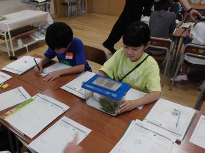 今日は、理科の学習で、モンシロチョウの幼虫とさなぎの観察をしました。子供たちは、様々な角度から観察をしていました。今後どのように育っていくのかを楽しみな3年生です。