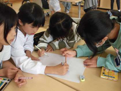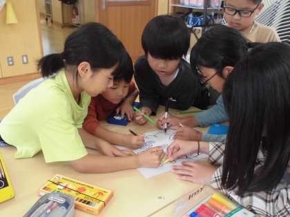 今日のロングわくわくタイムは、縦割り班でさつまいも畑のプラカードを作成しました。さつまいもの絵を描いたり、文字の色をさつまいもの色にしてみたり、各班創意工夫を凝らしています。