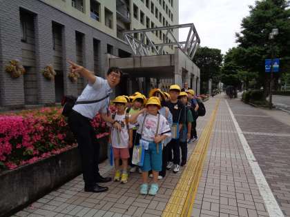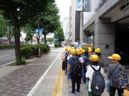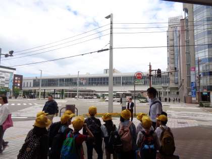 富山市役所から駅へ向かって歩いています。移動中にも、「ご飯のお店が多いよ」「カラオケが近くに4つもある」「交差点が縦横斜めになっているね」とたくさんの気づきがありました。