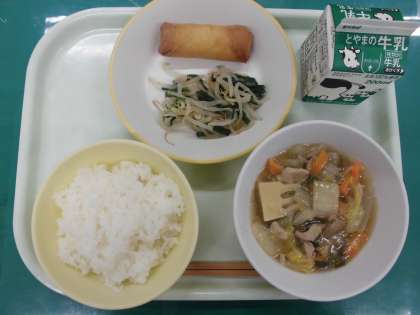 今日の給食の献立は、 ・ごはん ・春巻き ・塩ナムル ・八宝菜 ・牛乳 です。