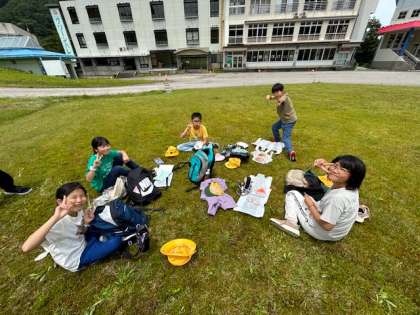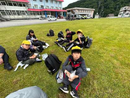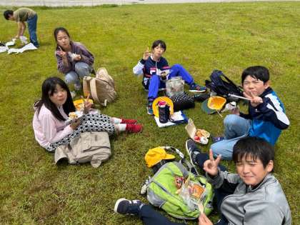 ウォークラリーの途中、牛岳温泉スキー場のゲレンデて昼食です。カモシカを見付け、子供たちは、大喜びです。