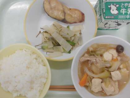 今日の給食の献立は、 ・ごはん ・ふくらぎの西京焼き ・昆布和え ・肉豆腐 ・牛乳 です。