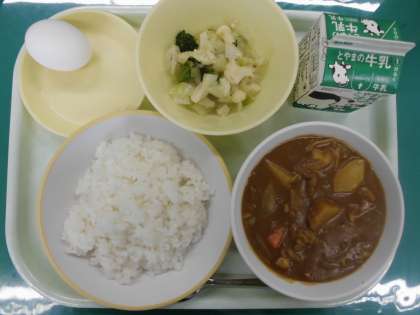 今日の給食の献立は、 ・ごはん ・カレーライス ・ゆでたまご ・はなやさいサラダ ・牛乳 です。