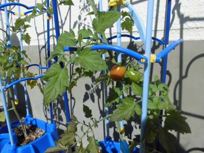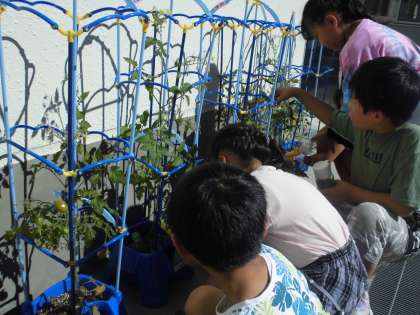 水やりをして、肥料をあげたり、ミニトマトの脇芽をとったりしています。今日は、赤く色づき始めたミニトマトを見て、「赤色のトマトだ!」と子供たちは喜んでいました。