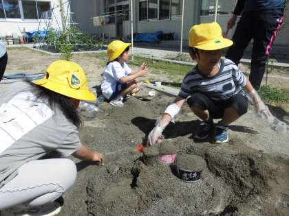 子どもたちは、山や川、トンネルや泥団子などを作り、思うままに砂遊びをしていました。
