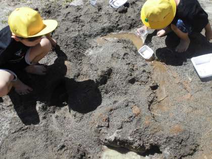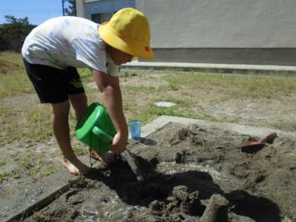 川をつくろうとして、水路を堀って水を流しましたが、砂に水が染み込むのを見て、「水がなくなってる!」と驚いていました。子供たちは、何が原因か一生懸命考え、「ここをもう少し掘ろう」「もっと水をいれて」などと、様々な工夫を試す姿が見られました。