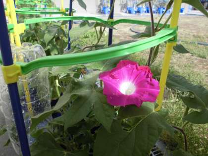 ついにあさがおの花が咲きました!きれいな赤紫色のあさがおです。
