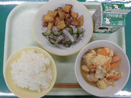 今日の給食の献立は、 ・ごはん ・魚とじゃがいものゴマからめ ・ゆかり和え ・親子煮 ・牛乳 です。