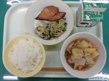 今日の給食の献立は、 ・ごはん ・ふくらぎの照り焼き ・甘酢和え ・豚肉とじゃがいもの旨煮 ・牛乳 です。