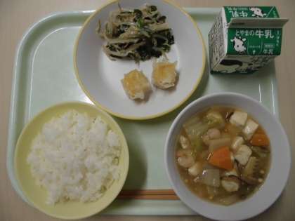今日の給食の献立は、 ・ごはん ・にんじんシューマイ ・ナムル ・エビと豆腐の旨煮 ・牛乳 です。