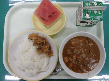 今日の給食の献立は、 ・ごはん ・夏野菜カレー ・福新漬 ・スイカ ・牛乳 です。