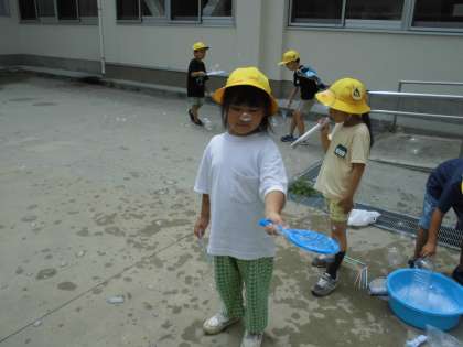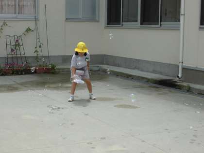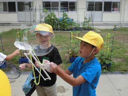 「うちわを使うと小さいシャボン玉がたくさん作れるよ!」「こうしたら大きいシャボン玉作れるよ!」とお互いに声を掛け合いながら楽しく学ぶことができました。