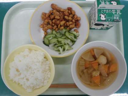 今日の給食の献立は、 ・ごはん ・鶏肉と大豆のあまからめ ・きざみあえ ・つみれ汁 ・牛乳 です。