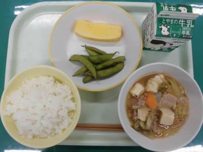 今日の給食の献立は、 ・ごはん ・厚焼きたまご ・枝豆 ・韓国風すきやき ・牛乳 です。