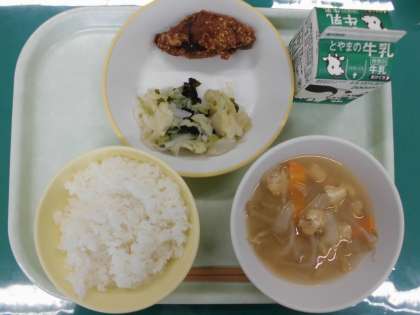 今日の給食の献立は、 ・ごはん ・魚の利休揚げ ・酢の物 ・みそ汁 ・牛乳 です。