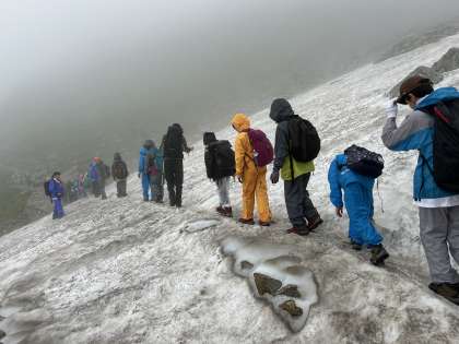 雨の様子を見ながら、少し登っています。雪渓も上手に歩きました。