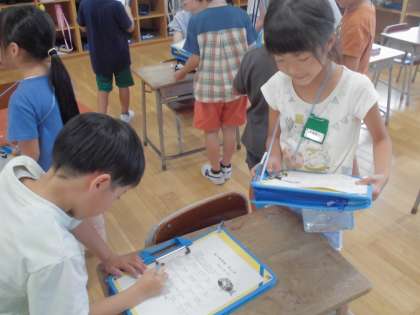 写真は、1年生の夏休みビンゴの様子です。ビンゴを通して、「自主学習をした?」「すいかを食べた?」など、夏休みしたことをお互いに聞き合っています。