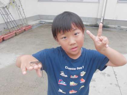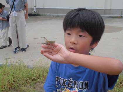 子供たちは、友達と声をかけ合いながら、夢中になって虫探しをしていました。コオロギやキリギリス、トカゲなど様々な虫と触れ合うことができました。
