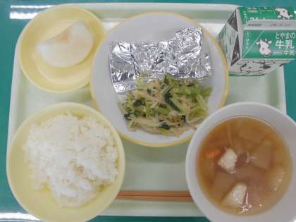 今日の給食の献立は、 ・ごはん ・さばの銀紙焼き ・はりはり和え ・冬瓜スープ ・梨 ・牛乳 です。
